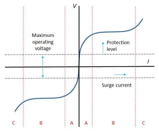 Varistors are transient voltage surge suppressors, or TVSSs, whose resistance decreases with increasing voltage [24], i.e., varistors are components that depend on the voltage on their terminals, with a symmetrical V/I (voltage/current) characteristic curve as exemplified at Figure 10. Considering a circuit or device to protect against transients, the varistor is connected in parallel to the circuit, building a shunt that will divert the voltage excess. The value of the voltage to be diverted should be defined accordingly to the device/circuit normal operating voltage. In other words, the suppressor will deviate part of the energy (voltage and current), allowing just the necessary voltage to feed the device.