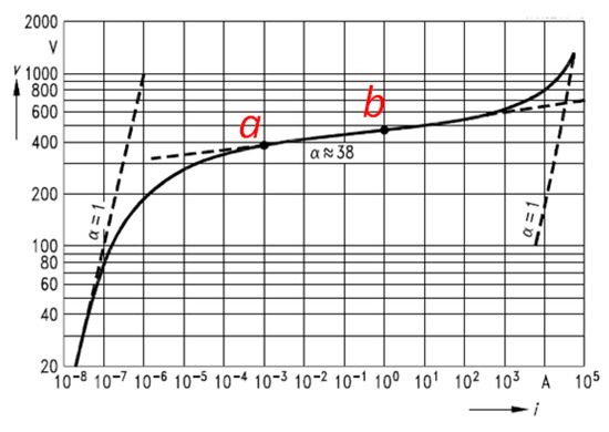 A typical varistor curve of a commercial product is illustrated in Figure 11, where, for simplicity, only the positive quadrant is shown in a log-log plot. Both α and β can be calculated from the technical specifications of each commercial varistor, considering the values of voltage and current for the points a and b (Figure 11) and using the following equations.