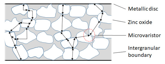 Varistors are polycrystalline ceramics made by mixing metal oxides and additives. The most common varistor is done with zinc oxide, ZnO, which offers a resistance highly dependent on voltage, besides great energy capacity. The grains of zinc oxide are conductive, but the other additives are highly resistant. Figure 12 shows schematically the composition of a varistor where the grains of ZnO produce several “microvaristors”, similar to Zener diodes [24]. Its physical dimension determines the electrical properties of a varistor because, as Figure 12 shows, microvaristors are connected both in series and in parallel. Therefore, the production of a varistor can determine the value of protection in terms of voltage, current, and energy. This is due to the thickness of the element (twice the thickness, twice the operational voltage due to the microvaristors in series), its area (twice the area, twice the operation current due to the microvaristors in parallel), and its volume (twice the volume, almost twice the energy absorption because there are as many twice the number of grains). Also, it is important to consider that the ceramic is compressed between metallic disks and their leads of tinned copper, adding an important capacitance characteristic to the suppressor. This high capacitance smooths the steep surge voltage edges, improving the protection level [24].