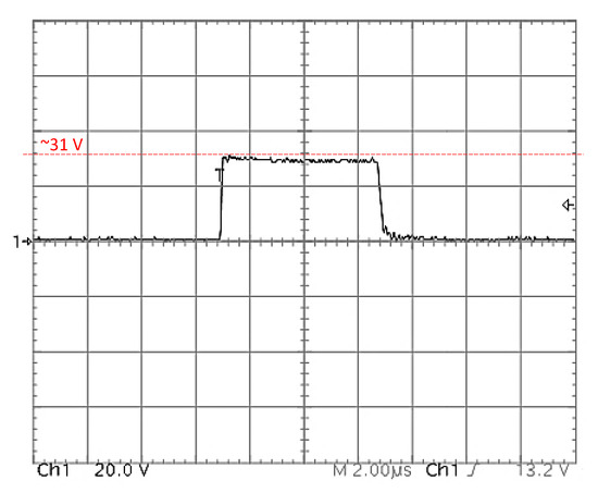 Using the same line parameters of Table 2, with a varistor S05K11 protecting the receiver load, a practical experiment was done in the laboratory. A 50 V squared wave, 6 µs, was applied to the line as an alien attack and the result is shown in Figure 13, where clamping values after filtering vary around 31 volts (compare to clamping simulations shown in Appendix A, Figure A1, top-left).