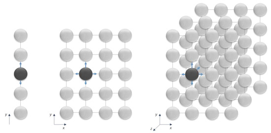 The case study presented is a one-dimensional model and does not show signals in the surroundings of the line. If the line is an antenna, for example, how can we predict the near- and far- electric and magnetic fields? The one-dimensional model can be extended to two-dimensional or three-dimensional models, applying the same process of reflected and incident signals travelling through the connections. Figure 14 illustrates these models considering Cartesian coordinates, which are useful for electric wave propagation—several models were developed to solve these problems and presented in [8,9,12]. If the problem is not Cartesian coordinate dependent, the dimension of the resultant matrix will consider each node degree. Each reflection will be the result of a function, dependent on the node characteristics. This process was used when we modelled the varistor, considering its internal nonlinear characteristics to give a response for each incident signal.