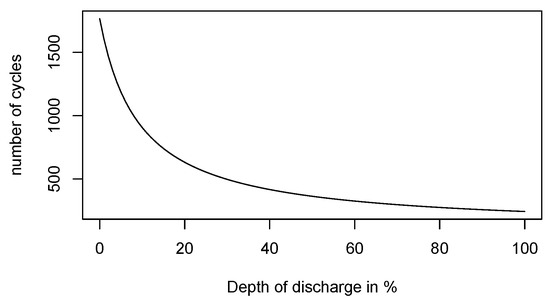 Ideally, an understanding of the chemistry of a particular battery will suggest some generic penalization function. However, in practice, there are diverse approaches to assess (in economic terms) how the battery life is affected by visiting a deep discharge state. Here, the usual cycle life graph (as in Figure 1), does not detail all aspects required by our approach. The point is that the cycle life is determined by charge/discharge periods oscillating linearly between the minimal and the maximal capacity, rather by a certain strategy run within a random environment. Such life cycle diagrams do not provide any information whether it could be worth visiting a deep discharge state for a short period of time in order to catch an electricity price spike. Given diverse battery storage technologies, there is no simple way of determining an appropriate penalization function. For this reason, the authors suggest a pragmatic approach: For a pre-specified penalization as depicted in Figure 2, the user will calculate the corresponding optimal strategy which must be examined and assessed in simulations. If required by simulation results, the penalty function can be altered, followed by another round of optimization and simulations. Such attempts can be repeated until satisfactory results (considering battery life expectation, peak load response, and total revenue) are reached.