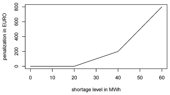 A function as in (43) for 60 MWh, penalizing the middle and upper range of shortage level.