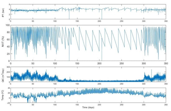 Figure 3 shows the time evolution of pressure (PT) and level (NVT) inside the tank, NG consumption, and ambient temperature of one year in one of the analyzed satellite plants. Pressure is controlled around 3–4 bar, and LNG level decreases by regasification consumption and refilling by LNG transfer between tanker trucks and storage tanks. In the middle of the year (mainly summer with a higher temperature), level drops are smoother because of a reduction in consumption.