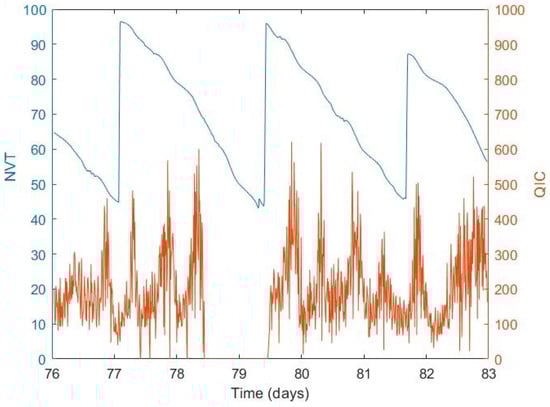 Figure 4 shows the time evolution of gas consumption (measured by flowmeter, QIC) and the level of LNG (NVT) in the storage tank of a satellite plant during several days of March 2018 after resampling with a sampled time of 10 min. There was discrepancy between the QIC flow sensor and the tank level in interval days 78 to 80, while the flow sensor indicated a zero value when tank level decreased. This anomalous behavior could not be detected by using Steps 2 to 4 presented in Section 4.1 because, in summer, gas consumption could be zero and remains in this state for several hours. This figure also shows that the tank level had cyclical behavior; after finishing the truck discharge, the tank level was at its maximum, and it decreased with consumption.