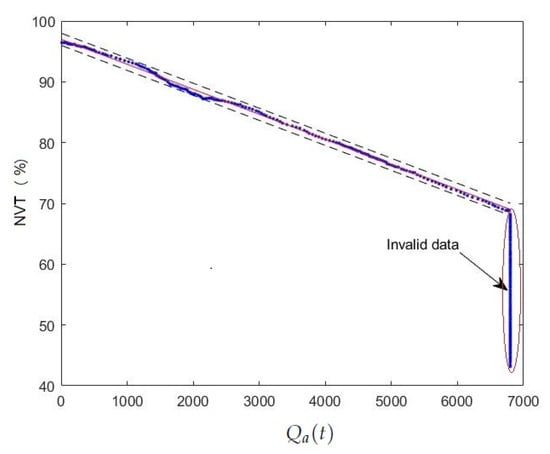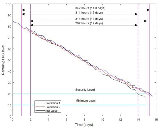 Figure 9 presents the decreasing tank level (black line), and the prediction level on the day (24 h; blue line) and on days (48 h; red line). In this study, we were interested in computing the RUL until the tank level reached its safety threshold, which meant an NVT of 20%. To this aim, we used Algorithm 1 with the following data: days, , , which is a set given by , and = 20. The first prediction gave an RUL of 342 h, while the second provided an RUL value of 311 h. Comparing with the real data, the prediction errors in the first and second prediction were 31 and 24 h, respectively. The RUL was calculated dynamically using the new observations obtained from the online monitoring system. It is possible to consider other safety indicators, for example, remaining time until the tank level reaches its minimal threshold.