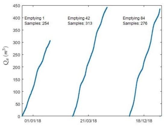 In order to obtain FIR models, it is necessary to define two parameters: The first is related to the fuzzification process of the variables (number of classes per variable) and the membership function, as was described in Section 4.2.1. In our case, there were two variables, is the temporal series given by Equation (10), and is the accumulated consumption given by Equation (8). Data were divided into 84 datasets corresponding with the time intervals between refilling; Figure 7 shows three of them. In this application, variables were discretized into three classes, and the equal-frequency-partition method was used to determine the membership function of the classes.