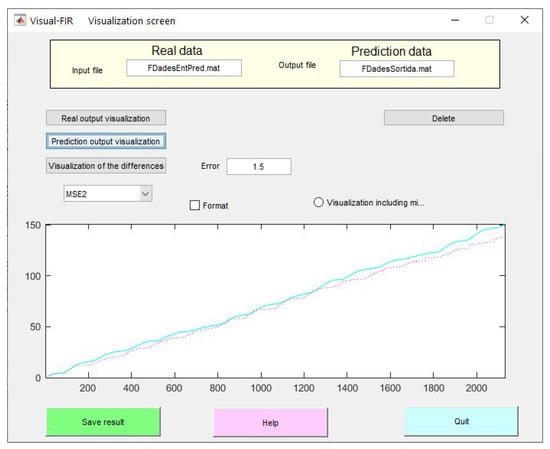 The whole available datasets were divided into training and evaluating sets. First, 68 datasets were used for training the model, and the remaining 16 datasets for evaluating the performance of the prediction model. Figure 8 shows the Visual FIR main screen where we can visualize the real output signal (blue), the predicted signal (red dashed line), and the mean square error (MSE2).