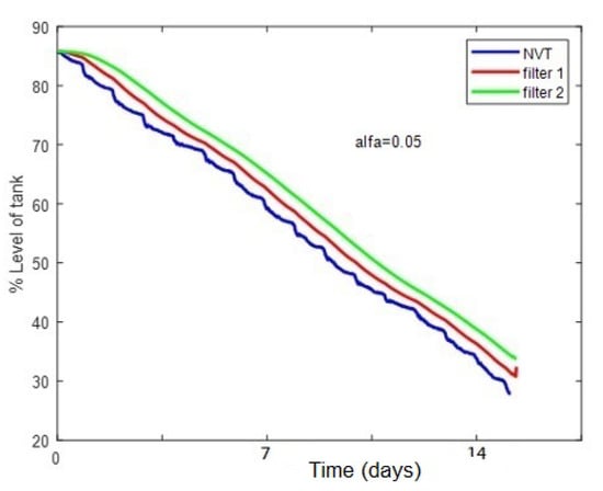 The double aliasing of Brown, explained in Section 4.2.2, is very useful for the prognosis of the remaining time to refill the tank. Figure 10 shows the temporal pattern of the decreasing level in the blue line, and the two filtered signals, in red and in green, with a prefixed parameter = 0.05.