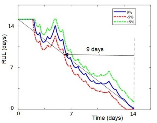 The sensor-data-driven prognosis approach proposes forecasting the RUL on the basis of a predetermined end-of-life or failure threshold (FT). As proposed in [36,37], the RUL is given by:
