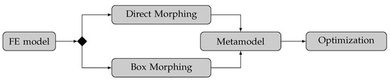 As illustrated in Figure 2, our approach builds on a given component FE model. Whether this is the model of a predecessor or a completely new FE model is insignificant. For our use case, we are especially interested in the influences of moving the component’s kinematic hard points at the connection points to neighboring components. Here, we use both a Direct Morphing-inspired (Section 3.1) and a Box Morphing (Section 3.2) approach to investigate the design changes systematically. In the practical application, one of the methods can be selected. The received simulation data are used to create metamodels that evaluate kinematic hard point location design choices and lead to fast decisions. The hard point locations can thus serve as optimization parameters for the component’s FRFs. By splitting simulation and optimization, it is possible to quickly change optimization targets without recalculating the FE simulation [20]. Additionally, the used metamodels can direct design choices without numerical optimization.