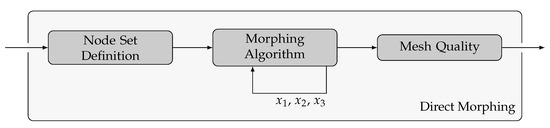 Each Direct Morphing process consists of three subprocesses, shown in Figure 3. First, we define the nodes for the three different node types, mentioned in Section 2.2. Control nodes are points in space, that impose a given displacement, free nodes are nodes of the FE mesh that are free to move and fixed nodes are points in space that stay at their locations during the morphing process. Next, we apply the actual morphing algorithm onto the set of free nodes and receive their new coordinates. This is done separately for the three directions , and . This results in the preliminary morphed mesh. Mesh quality criteria indicate where node relaxation or remeshing is necessary in a last step, resulting in the final morphed mesh.
