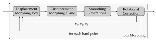 The morphing itself is also automated in a Python script that only needs the displacement at each kinematic hard point of the component as input values. The morphing process is fragmented into the four steps, presented in Figure 4.