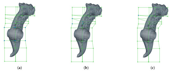 The displacement of the hard point is fully realized by moving the morphing box that includes the specific point. This leads to a rather edgy geometry surface which is smoothed by moving two additional sets of control points. Those sets were evaluated empirically and showed satisfying results so that no third smoothing operation is needed. Figure 6 shows all control points being moved to achieve a smooth structure. Figure 6a highlights the control points necessary for the actual displacement. Figure 6b,c highlight the sets of control points moved to achieve a smooth surface.