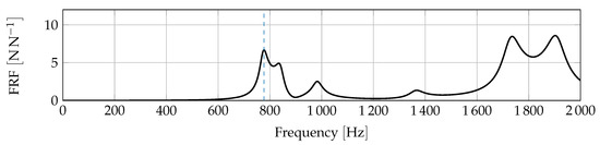 For the study in this paper, we investigate the FRF between the hard point P for the track rod connection in the direction along the track rod (), marked by the blue arrow on the left in Figure 7 and wheel hub in vertical direction (), marked by the blue arrow on the right. This FRF represents the transfer path of vertical excitation from the road to vibrations induced into the track rod. The FRF is given in Figure 8.