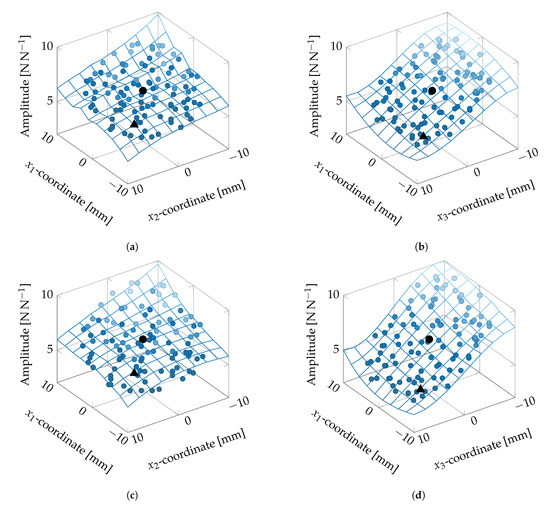 The amplitude at 777 clearly depends on all three variables. In Figure 10b,d, we can recognize a direct dependency on the coordinate. With varying the coordinate, the amplitude hardly changes compared to varying the -coordinate. The combination of both metamodels indicates an optimum location for P at a small -value, great -value and great -value. The - and coordinates seem to have smaller influence than the coordinate and even could stay near 0 , depending on the other coordinates. These simple metamodels allow a fast decision for the direction of change, without numerical optimization. We validate them in the next section.