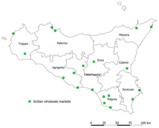 The next step was focussed on wholesale market localisation. After a direct interview with the regional coordinator of wholesales market activities, the Sicilian active wholesale markets were located within Sicily region by considering their GPS coordinates, and a GIS map was made as shown in Figure 4.