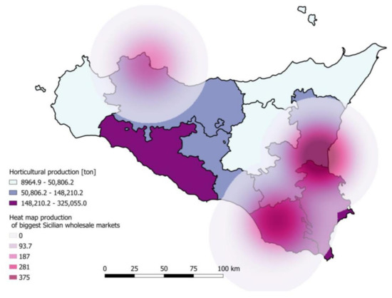 As shown in Figure 6, by considering all the horticultural products, the provinces of Syracuse, Ragusa, Agrigento, Catania, Palermo and Caltanissetta were highlighted as the most productive ones. Furthermore, the results of the analysis of the production of the three selected biggest wholesale markets confirmed the results obtained with the ISTAT database on the horticultural production by highlighting three different areas (Figure 6).