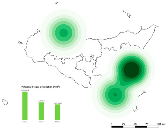 The last step of the study was the computation of the potential biogas production by recycling FVWs. As reported in Table 3, the FVWs were computed, and by using Equation (1) the potential biogas was estimated to be about 7 million of Nm3 [44]. In detail, as reported in Figure 7, the heat map with potential biogas production obtainable by the three selected wholesale markets was produced. Moreover, the potential production from each considered wholesale market amounts to about 3.3 million Nm3, 2.1 million Nm3 and 1.8 million Nm3, respectively, for the wholesale markets located in the municipalities of Catania, Vittoria and Palermo. As shown in Figure 7 the wholesale market located in Catania province is the biggest one, with the highest flow production and potential biogas production.