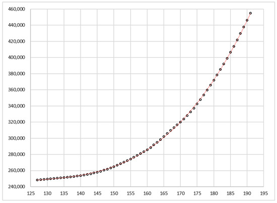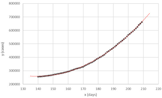 As an example of the facility of the cubic function to fit the pandemic curve (y), Figure 1 shows the fit with data from Spain between July 12 (x = 140) and September 19 (). The seventy values were adjusted to a cubic equation with , median relative error = 0.13%, and interquartile range (IQR) = 0.92%. The analytical curve in this figure is not a predictor, since it was obtained when all the information was already available on the corresponding dates, but shows a great facility of the cubic function to reproduce the cumulative number of cases on pandemic curve.