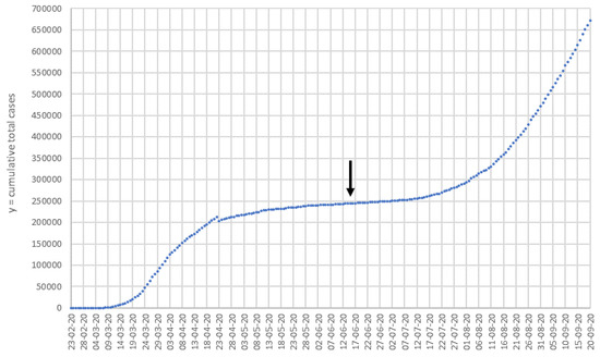 Cumulative number of cases in Spain from 23 February until 20 September. The arrow marks an inflection point at 15 June, which theoretically separates the two pandemic waves. Data source: Centro de Coordinación de Alertas y Emergencias Sanitarias (CCAES).