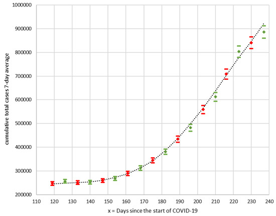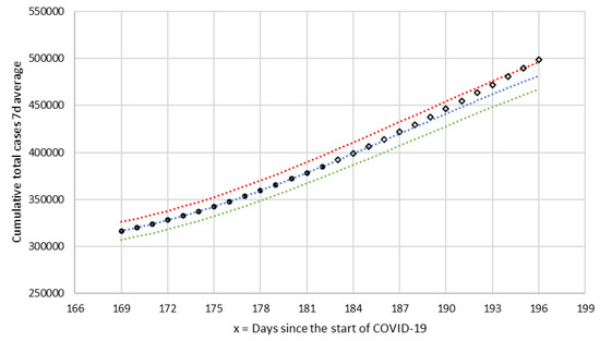 As an example, in Figure 4, the curves from section T-6 are represented. In this section, there exists a transition from positive to negative acceleration (from concavity to convexity) with an inflection point in x = 188 (28 August). The set of 14 values corresponding to the total number of cumulative number of cases from 10 August (x = 169) and 23 August (x = 182) was adjusted by linear regression to a cubic polynomial (), and from the equation, the three predictive curves were obtained: , , and (standard, favorable, and unfavorable). In order to compare the forecasts with the observed values, the values from August 24 were represented with a different symbol (rhombuses). In this section, it can be seen that they are located between the curves and until 6 September (x = 196), when the observed is higher than unfavorable forecast . According to the criteria established in the algorithm, on the day that the section is considered finished, three new predictor curves are calculated. Obviously, in the last observed point, the relative error exceeds the criterion value of and reaches a value of 3.30%, indicating the need for a new section.