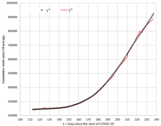 In Equation (1), y represents the cumulative number of cases since the pandemic start, and x is the number of days since the pandemic starting date.