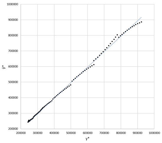 As an initial approach to the forecast quality, the coefficient of determination is used. The value of this coefficient for the arrays and is the set of the nine calculated predictive sections. This indicates a very high capacity of the algorithm to replicate, with an anticipation until two weeks, the observed results. In Figure 6, the values of are represented as a function of those of with very good correlation between both arrays: ( 0.9997).