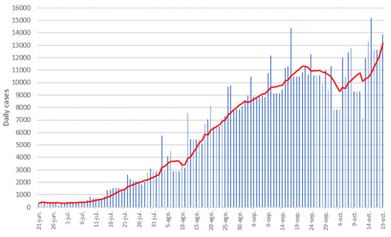 The irregularities shown by the nowcasts of 19 September and 3 October are a reflection of those that occur in the records of the cumulative number of cases that, at the time of writing this work, indicate an indefiniteness of trends, as can be observed in the epidemic curve of daily cases in Figure 10, with numerous irregularities since mid-September. It can be affirmed that the growing trend of infections began to slow down in the first half of September, which indicates that the curve began to flatten because the measures that began to be adopted at that time were effective; although, today, it cannot be known yet if they were sufficient.