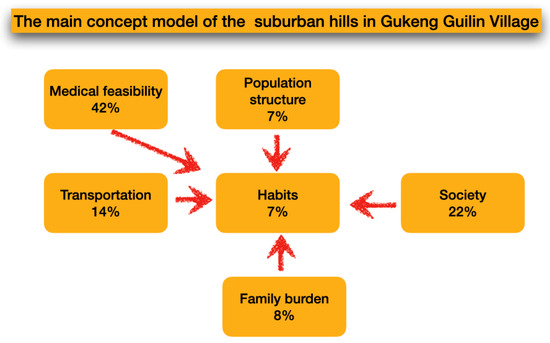 In order to further clarify and elaborate upon the quantitative data, this research involved three field studies in the suburban hills along with one focus group discussion conduced with seven participants. The potential participants were recruited from a local villager permanently residing in the field and local health service providers, e.g., pharmacists, social workers, and care givers. The researchers explained the goal of the study to the group of participants before they were engaged in a semi-structured, audio recorded discussion, and photos were taken for nearly two hours. Each of the five individual researchers assigned meaningful codes and identified concepts embedded in the collected data. Afterwards, they collectively resolved debatable codes [9]. The concepts identified as the main factors to form the follow-up suburban hills health support model are provided below. Table 2 shows the examples of meaningful codes in relation to the conceptualization in qualitative research.