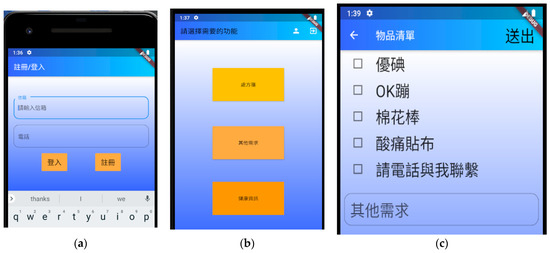 Main interface and functions design in traditional Chinese character. (a) is registration and login in screen by key in phone number; (b) is function selection, three large buttons provide medicine, daily necessities, and health consultation respectively; (c) provide items selection without input words.