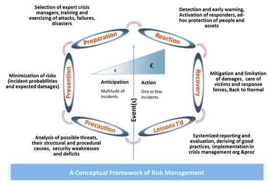 Security is the most fundamental need of humankind, following the basic physiological needs for food and water (https://www.simplypsychology.org/maslow.html#gsc.tab=0) (accessed on 20 May 2021); this is true for societies, groups and individuals. The protection and integrity of lives and possessions are deeply anchored in the psyche of mankind, due to evolution’s survival and selection principle, and are present in mankind’s organizational constructions. Treats are usually classified as natural disasters, technological risks and man-made disasters. The basic prerequisites for establishing and maintaining security are subsumed in the term Risk Management. A typical organization scheme of risk management is presented in Figure 3.