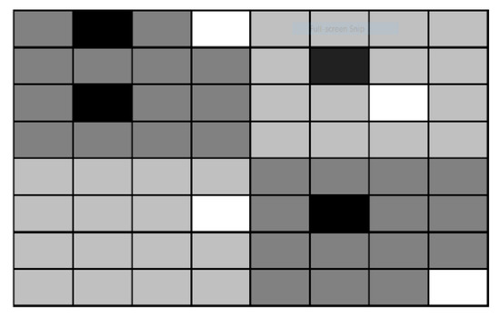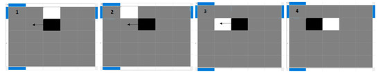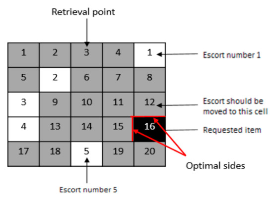 Our puzzle is a rectangle which consists of several rectangular cells with the same dimensions. In puzzles, we represent each agent by one cell. Each cell plays the role of an independent machine which can store an item or can be empty. The cell decides whether to keep the stored tote or pass it either forward, backward, to the left or to the right. Each network consists of some empty cells referred to as white cells or escorts. White cells direct the requested item and move along with it to the exit point (Figure 1). The number of white cells in each network affects the efficiency of the whole network. Stored items—which we represent in gray color—can be considered as goods, totes (items), pallets or unit loads; the network can call each of these items for retrieval. We represent the requested item in black color.