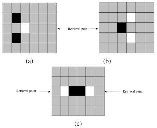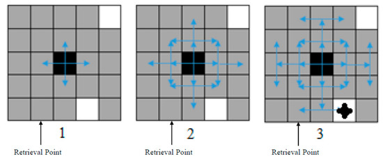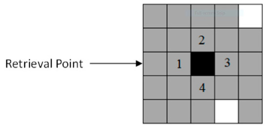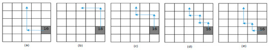 In this example (Figure 11), we have one black cell and five white cells. The black cell should be retrieved from gray cell number 3. Based on the retrieval point, the black cell has two optimum sides, and each optimal side has a different closest white cell. Using our searching–moving phases, we obtain five possible paths to retrieve the black cell from the puzzle (Figure 12). Considering the required number of movements associated with each path and each white cell, shown in Table 1, our algorithm selects path (d), meaning that the black cell must seize white cell number 1 in the searching phase. Indeed, the main reason for the optimality of path (d) is using the greatest number of 3 moves to retrieve the requested item.
