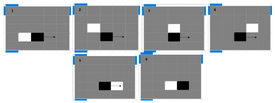 Our puzzle in this example includes one black cell and two empty/white cells (Figure 10). We assume that the item should be retrieved from the top right-hand corner of the puzzle. Therefore, the optimal side of the black cell (our requested item) is its upper side—marked in red. Then, the black cell must find the closest white cell. Since the distance from the optimal side of the black cell to each white cell is the same, we are in a deadlock situation. Our deadlock prevention algorithm leads the black cell to randomly select one of the white cells. The black cell chooses the white cell at the bottom and moves it closer to the optimal side—as we observe in the second frame. This continues until the white cell reaches the optimal side shown in the fifth frame. When the black cell moves to the position of the empty cell, the algorithm must select the next white cell considering its distance to the optimal side. At this step, since the white cell at the top of the board is closer to the optimal side, it is selected and moves toward the optimal side of the black cell—as frames 7 through 9 show. This cycle of searching–moving continues until the item exits the board.