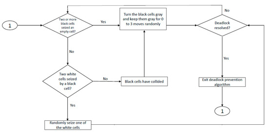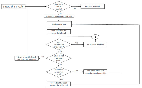 As Figure 8 shows, the algorithm first randomly selects one of the black cells and identifies its location and optimal retrieval side in the puzzle. Then, the nearest white cell is selected, and potential deadlocks are resolved. At this step, the search phase finishes, and the algorithm enters the moving phase. In the moving phase, either a white cell moves toward the black cell, or vice versa. Finally, when the black cell reaches the retrieval point, the item is retrieved, and the black cell becomes an empty cell. We present the flowchart for the deadlock prevention part of the algorithm in Figure 9.