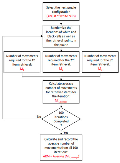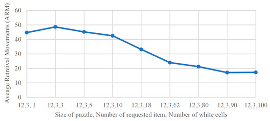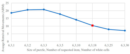 In this section, we investigate how the number of empty/white cells and the puzzle size affect the number of movements needed to retrieve black cells. We developed an object-oriented program to simulate more than 50,000 iterations using different puzzle configurations. As Figure 13 shows, we first generate a puzzle with a specific size and number of empty cells. Then, we randomly place the white cells, three black cells and a retrieval point into the puzzle. Finally, we take the average of the number of movements we need to retrieve each of the black cells. In each iteration, we randomly change the locations of the white and black cells. After 100 iterations, we find the average retrieval movement (ARM) for each one of our puzzle configurations.