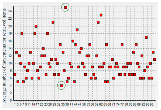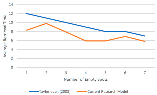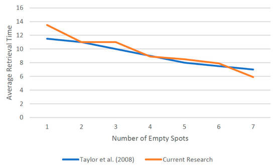 Taylor and Gue [23] studied how the location of the white cells impacts the average retrieval time for two configurations: (i) random distribution of empty cells and (ii) input/output distribution where white cells are at the retrieval point. We compared the results of our algorithm with their results for these two configurations. As Figure 19 shows, our algorithm outperforms their results in the input/output distribution configuration. However, the results are similar in the random distribution configuration (Figure 20).