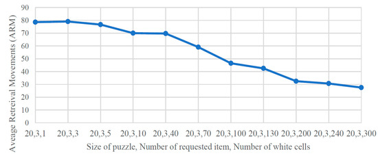 Using simulation, we emphasized the effect of empty cells on the retrieval time. We observed that in the presence of less than three white cells, increasing the number of white cells increases the ARM. As the number of white cells grows above three, increasing the number of white cells decreases the ARM sharply. However, above a specific number of white cells, this decreasing trend becomes less significant. We explained this pattern by two effects of increasing the white cells in our algorithm: Options Effect and Deadlock Effect. By growing the puzzle size, the above-mentioned pattern repeats again—we observe another “sharp decrease in the ARM followed by a slight decrease”. This finding can play a key role in balancing the “puzzle density–ARM” trade-off in storage systems.