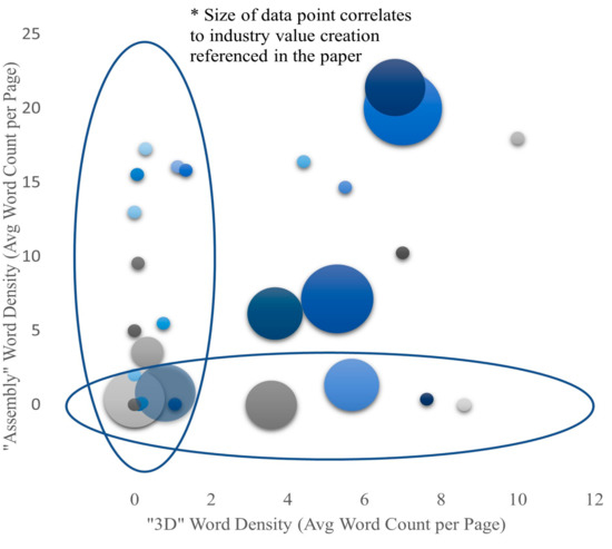 To better understand the value of the 3D product model in the assembly process, a literature review was conducted. Journal papers, articles, and conference papers were sourced using the Compendex and Scopus databases. Articles searched for included reference to “3D” and “assembly” but not “printing” (in order to remove articles on 3D printing, which is not the focus of this study). Then, an analysis was run on the number of times these key words were used throughout the article. Noting that some articles are longer than others, the total count was divided by the article page count to get an understanding of the density of the use of the “3D” and “assembly” keywords in each article. Each article was also reviewed for mentions of the value that using 3D product models in the assembly processes could create. Such value might include improving the efficiency and reliability of the assembly process design, reducing process planning problems, and shortening the process planning cycle [1,2]. Then, the same approach was taken in terms of dividing the number of mentions of value creation by the total page count to get a density value for value creation mentions in each paper. The plot of these relative densities of “3D” to “assembly”, where “value creation” is the size of each bubble, is shown in Figure 1 [1,2,3,4,5,6,7,8,9,10,11,12,13,14,15,16,17,18,19,20,21,22,23,24,25,26,27,28,29,30,31,32,33,34] where each different colored bubble represents a different journal paper, article, or conference paper. Figure 1 demonstrates that while there was a lot of research published on 3D product models, and an equivalent amount published on assembly processes, less literature had been published on the use of 3D product models in assembly. This was especially evident in the lack of data points in the upper right corner of Figure 1 and the fact that of those papers that do have a high density of “3D” and “assembly”, there is still a gap in the literature in terms of the value that the use of 3D product models creates in assembly processes. Exploring this gap and better understanding the value that 3D product models create in the assembly process provided the guiding purpose for this research.