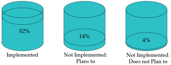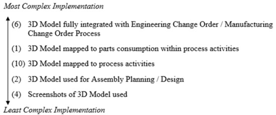 Of the 28 survey respondents with enough data for analysis, the responses were categorized into three buckets as noted in the Materials and Methods section of this paper. A total of 23 respondents (82% of those analyzed) said that they have implemented the 3D product model in the assembly process. Note that assembly process means assembly planning and design and/or assembly shop floor execution. A total of five respondents said they had not yet implemented the 3D product model in the assembly process; of those, four respondents (14% of those analyzed) said they planned to implement the 3D product model in the assembly process, and one respondent (4% of those analyzed) did not plan to implement the 3D product model in the assembly process. This categorization of the survey responses is shown in Figure 5. It is worth noting that of the 23 respondents that implemented the use of the 3D product model in the assembly process, eight had implemented the use of the 3D product model in assembly planning and design but not shop floor execution, one had implemented the use of the 3D product model in shop floor execution but not assembly planning and design, and 14 had implemented the use of the 3D product model in both.