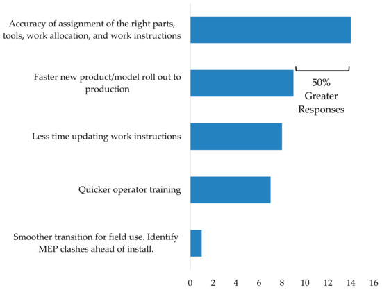 Once technology enabled the use of the 3D product model in the assembly process, research was conducted demonstrating how the 3D product model could be used in the assembly process planning, assembly design, and assembly shop floor execution processes (referred to in individual and in aggregate as “the assembly process” for the sake of brevity in this paper). This can be done by integrating the 3D product model with assembly line balancing via process consumption and leveraging the 3D product model in the link between the Bill of Process and the Bill of Materials including Model/Option dependency [18,35]. A similar approach includes the creation of a digital mock-up to transmit models and attribute data between the Engineering Bill of Materials and the Process (or Manufacturing) Bill of Materials and serve as a unified data source in assembly planning [19]. By implementing such approaches, the use of the 3D product model in assembly processes allows for engineers to check the product’s configuration for assemblability [20]. The 3D product model can also be used on the shop floor to enhance shop floor work instructions, improve process planning, and increase efficiency of assembly work [21,22]. Each of these studies indicate ways that companies can utilize the 3D product model developed by design teams in assembly processes. Given that some research has shown that such a feat is possible, then, the question becomes whether industry sees value in using the 3D product model beyond product design, and if so, in what areas industry believes value exists.