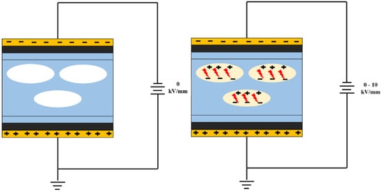 High voltage was delivered by a voltage amplifier of gain 1000 (TREK10/10 B, Trek Inc., Lisses, France). Input was controlled by a function generator (Agilent 33220A, Santa Clara, CA, USA). The sample had a surface area of 400 mm2, and the electrical charges were injected for a duration of 15 min. Figure 1 gives a schematic representation of the electrical ionization process. The electrical charging process was performed in silicone oil. The silicone oil used in the experiment is a dielectric liquid consisting of polydimethylsiloxane with a purity specially controlled for use in electrical engineering.