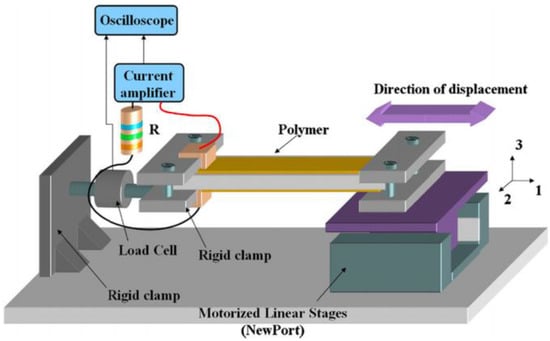 For the active energy harvesting system investigated within the scope of this study, electric energy parameters were performed. The setup for characterizing the current and voltage collected by flexible materials is shown schematically in Figure 2. These measurements were made with a one-degree-of-freedom table. The material is held in place by two jaws, one of which is movable and attached to the table through a degree of freedom, while the other is immovable and connected to the force sensor.
