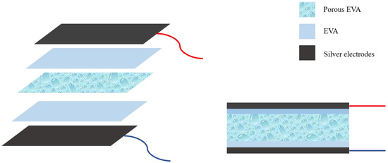 The material used in this work is a thin film flexible multilayer structural device with an EVA film between 160 and 320 μm. The device is then encapsulated in between two thin EVA protective layers without pores. The multilayer material is sandwiched in between two 12 nm thin film metal electrodes (Figure 3). The film compositions are summarized in Table 1.