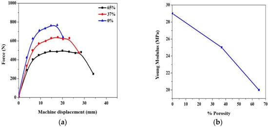 (a) Applied force as a function of machine displacement of EVA 0%, EVA 37% and EVA 65%. (b) Young’s modulus as a function of porosity percentage.