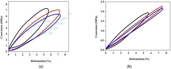 Figure 5a,b represent the stress–strain hysteretic response of porous EVA when exposed to frequencies of 4 and 20 Hz, respectively. Each frequency was subjected to six separate tests. The average of the six experiments is shown in Figure 5. When porous piezoelectric EVA is exposed to cyclic mechanical stress, it develops hysteretic behavior. Microstructural changes such as cell morphology, matrix mechanical proprieties, and other potential permanent microstructural changes such as cracking cause the hysteretic response under the mentioned loading conditions.