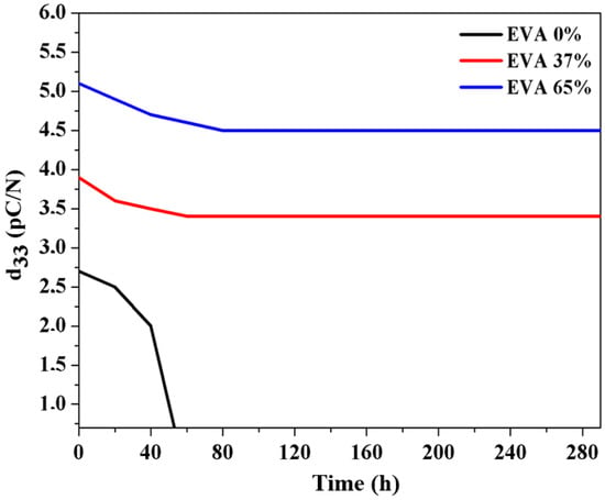 Figure 7 illustrates the temporal evolution of the piezoelectric coefficient, which was measured outside of the laboratory. After the relaxation period, the measurements were collected at room temperature. The d33 piezoelectric coefficient value for EVA 65% reduced from 5.1 to 4.5 pC/N from 0 to 65 h, after which it stabilized at 4.5 pC/N. However, these piezoelectric activities were unstable, and a reduction was observed 65 h after the ionization step. Moreover, the charge in cellular EVA remained constant after this time.