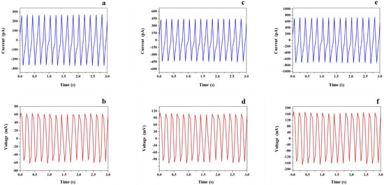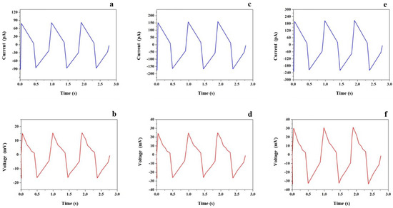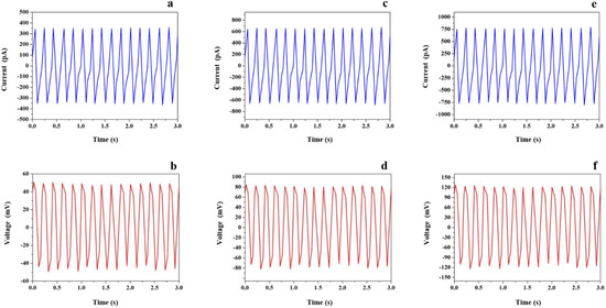 Electrical characteristics harvested by EVA 65% as a function of time under a transverse displacement with various values of strain SM. (a) current harvested with SM: 0.25%, (b) voltage harvested with SM: 0.25%, (c) current harvested with SM: 0.50%, (d) voltage harvested with SM: 0.50%, (e) current harvested with SM: 0.75%, (f) voltage harvested with SM: 0.75%.