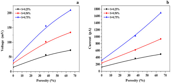 Porosity content influence on the electrical characteristics harvested by cellular EVA with three values of strain SM: 0.25%, 0.50% and 0.75%. (a) Voltage harvested; (b) current harvested.